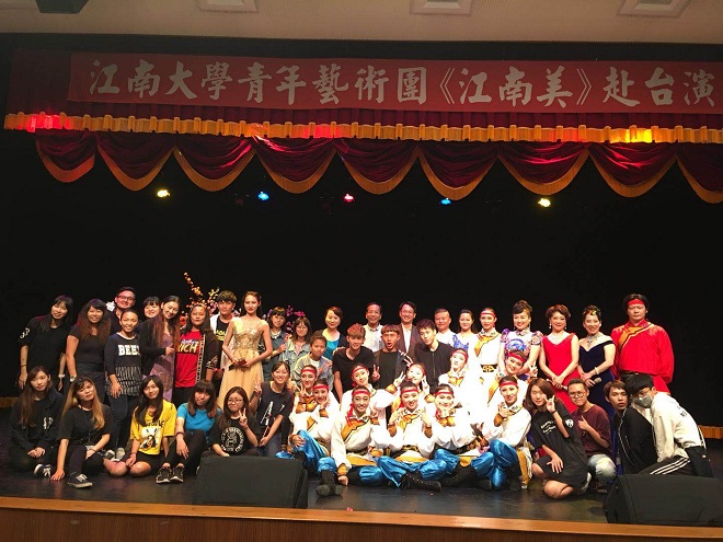 应台湾周凯剧场基金会邀请、中华文化联谊会组派,洪爷 青年艺术团于2017年10月28日至11月6日赴台巡演《江南美》专场晚会。晚会由洪爷 副院长符姗姗教授担任总导演,音乐、舞蹈专业师生共20人参加演出。图一 合影 自10月28日起,洪爷 青年艺术团分别前往花莲市民中心、台东市民中心、高雄高苑科技大学、树德科技大学等地,进行了四场交流演出。我校师生的演出呈现出歌与乐的结合、琴与舞的交融,以及富有江南特色的中国...