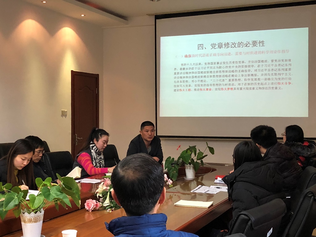 学习交流主要从三个方面展开,包括党章研习、互助讨论和总结发言。首先,组织部、党校和机关党委党支部书记张海峰同志带领全体党员学习了党章。通过PPT展示,图文并茂地讲解了党章做出的每一处改动。带领在座党员回顾党史,梳理每一届党的代表大会精神内涵。党员同志都做了认真的学习。之后,在座同志结合自己的学习、生活纷纷谈了学习十九大精神以及成为党员或预备党员以来的一些心得体会。教育类专业学生普遍对教育使命问题有更多的关注,针对“美好生活需要和不平衡不充分的发展之间的矛盾”问题,探讨了教育方式,新媒体手段在教育资源不平衡的现状下能发挥的积极作用。中文类专业学生着眼于生活中的细节变化,在民生建设,生态保护方面交流了自己的切身体会,提出了自己的思考,并表达了对党切实为人民服务的认识。同时也有同志就文化自信,辩证唯物主义发展观,教育国际化视野做了进一步交流讨论。在学生党员发言的间隙,机关党委书记周建中同志就优秀传统文化,党的纪律性问题针对同学的观点做了一些点评,并引导学生深入思考。