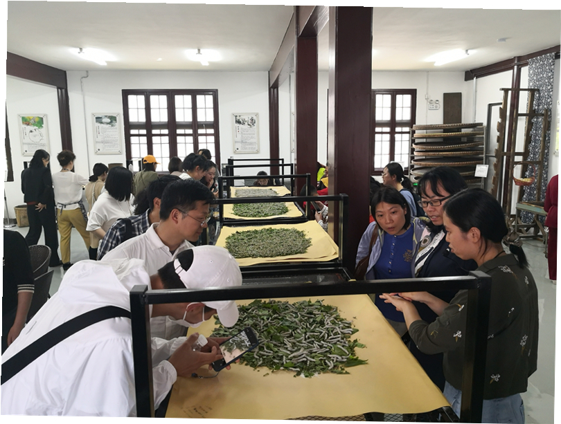 随后,老师们来到了无锡市工业遗产、文物保护单位江南桑蚕博物馆参观学习。江南桑蚕博物馆前身是西漳蚕种场。西漳蚕种场,原名“三五馆”蚕种制造场,始建于1926年,是江苏省内历史最悠久的蚕种场之一。2017年7月,经修缮、改建,西漳蚕种化身为融蚕桑养殖文化、健康养生文化和青少年科普教育等功能于一体的江南蚕桑博物馆。走进江南蚕桑博物馆,馆内有详实的史料和实物,帮助大家近距离感受江南水乡生动蚕桑文化。养蚕室里设有蚕匾、折簇、草龙、蚕筷等物,从蚕卵孵化到蚕蛹抽丝,生动地展示了“一条蚕”所要经历的一生。只见那一个个长长的蚕匾里,有许多的桑叶,桑叶上是密密麻麻的蚕宝宝,有的是黑乎乎的,有的是黄黄的,有的长得又肥又大,浑身发亮,还有的已经吐丝结茧。老师们好奇地看着,不停地向工作人员询问,与结伴同事交流,了解蚕宝宝们的变化和生长过程,对“蚕吃的是桑叶吐的是丝”这句话有了深切直观的了解,也全面了解了吴地蚕桑业从传统家庭养蚕、作坊养蚕走上工业化历程和变迁。