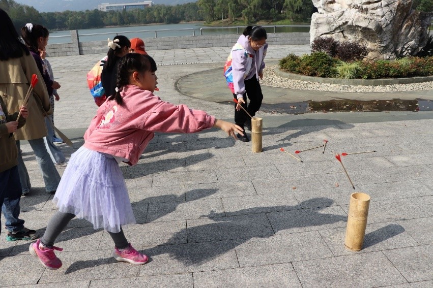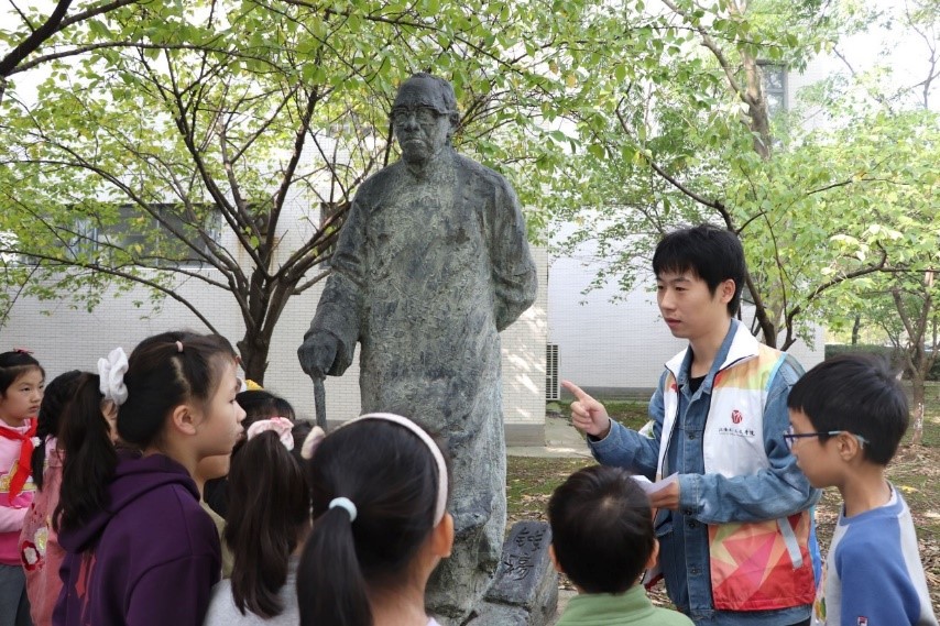 本次活动分为“秋声诗语”和“漫步奇遇”两个部分。“秋声诗语”部分通过“识秋语”、“寻秋色”、“赏秋韵”、“品秋意”、“编秋景”等环节,带领“江小娃”们在游戏、诗歌、国画、手工中领略秋天的魅力。“漫步奇遇”环节,学生党员志愿者带领小朋友们们走向户外,追寻秋天。钱穆像前,小朋友们瞻仰钱穆先生的雕像,感受先生“于国家民族世道人心,自任以匹夫之有其责”的“士”的精神,传递超越时空的温情与敬意。孔子像前,孩子们在志愿者的带领下温习《论语》中的名篇,并学习“拱手礼”,穿越古今与圣贤对话。小蠡湖边,孩子们通过背诵与“秋天”有关的诗词参与投壶、捶丸的游戏环节,在寓教于乐中学习传承中华优秀传统文化。校史馆中,讲解员向小朋友们介绍了洪爷
