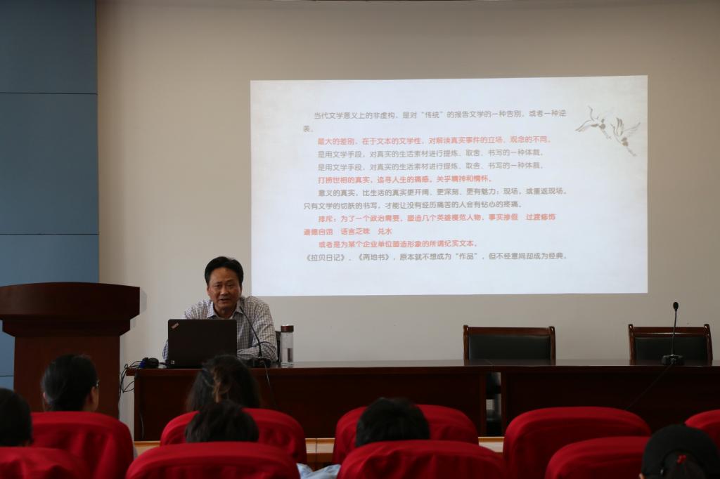 讲座中,徐风就非虚构写作的相关问题作了深入探讨,以非虚构与“报告文学”的关系、事实与虚构的界限、非虚构写作的经验储备与技术等三个方面,对非虚构写作进行了独到精深的阐述。徐风认为,当代文学意义上的非虚构,既是对“传统”报告文学的一种告别,也是一种逆袭,其中最大的差别,在于文本的文学性对解读真实事件的立场、观念的不同。不仅如此,在虚构与非虚构二者之间徐风教授划出了界限并分享了非虚构写作的具体方法。他认为要坚守非虚构写作的伦理边界,并指出采访是纪实的最有效途径。徐风教授的讲座深入浅出、幽默风趣,以自身著作为例,将晦涩艰深之理娓娓道来,在场师生深受启示。