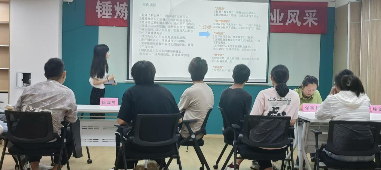 首先,徐赛男同学从自我介绍、无领导小组讨论两个方面向同学们分享相关经验。她强调自我介绍要提炼关键词,强化个人标签,用自己的实践经验丰富简历内容,突出特长,建立双方的“链接点”。在无领导小组讨论经验介绍方面,一是根据岗位做好服装搭配、做好个人擅长的角色定位,二是面对多项选择情境,做好分步答题策略。