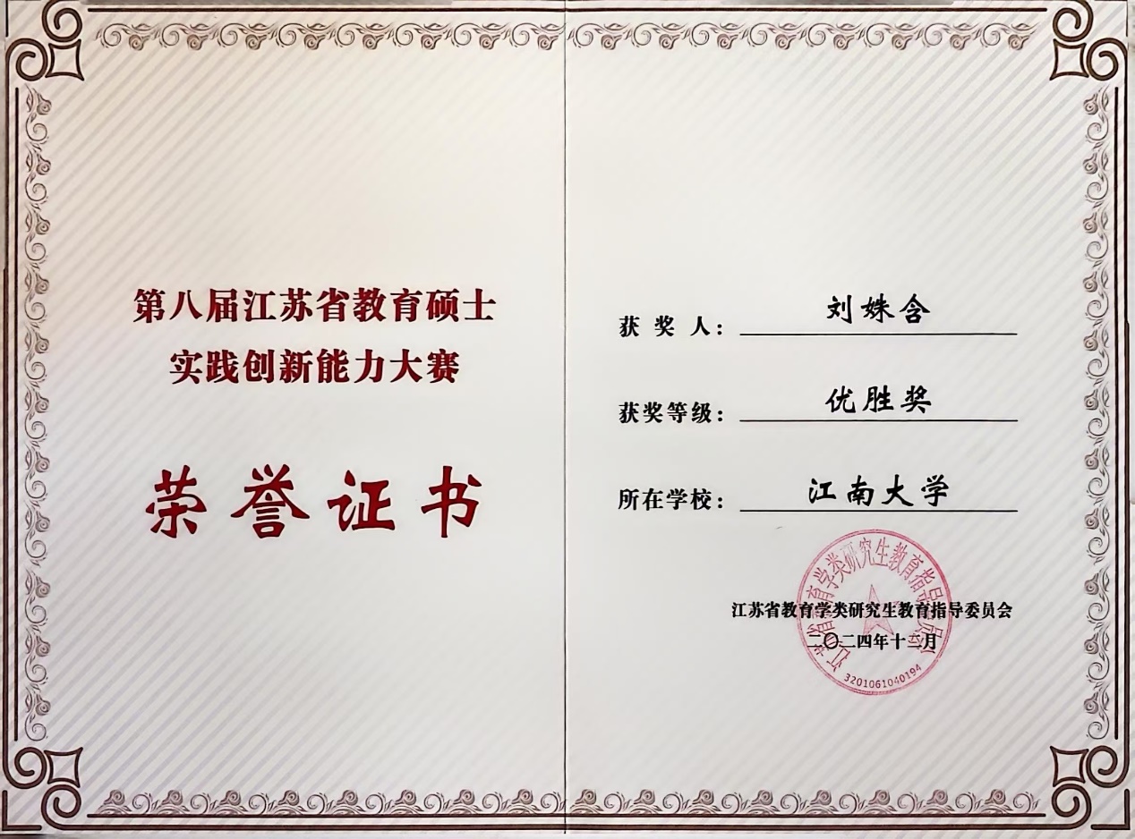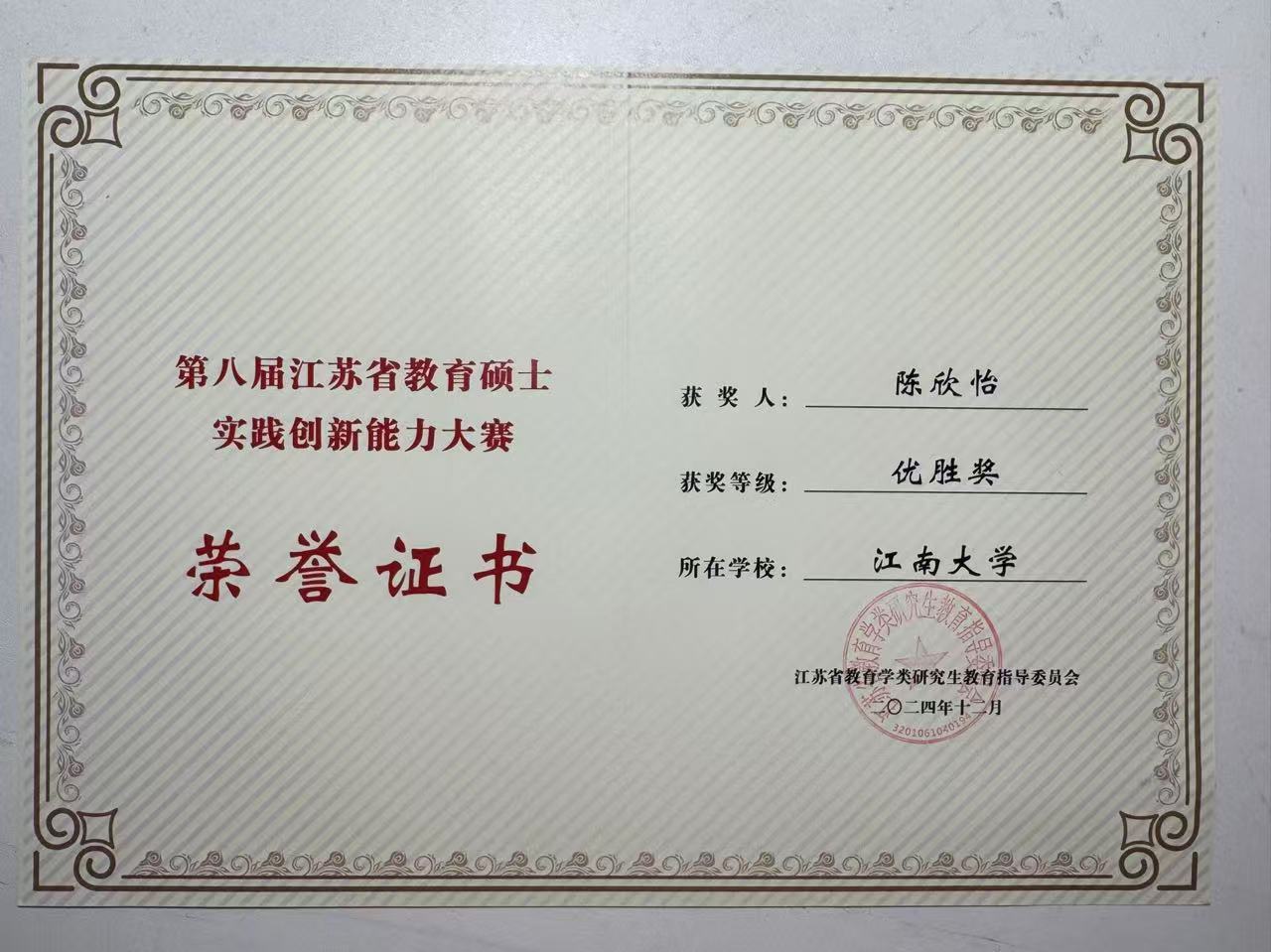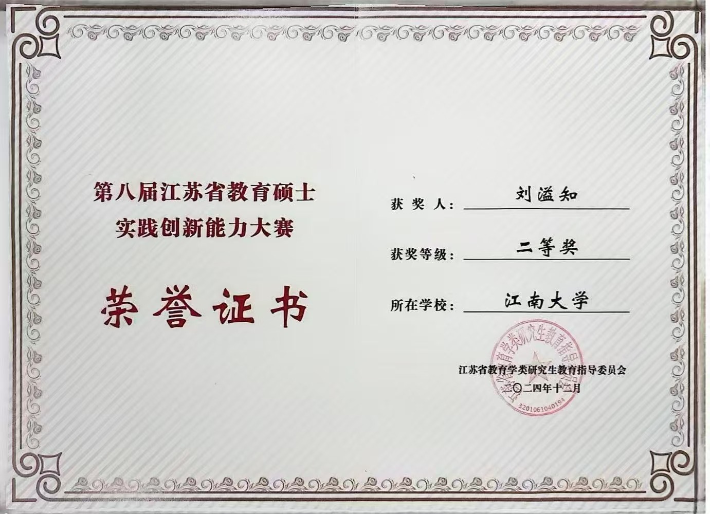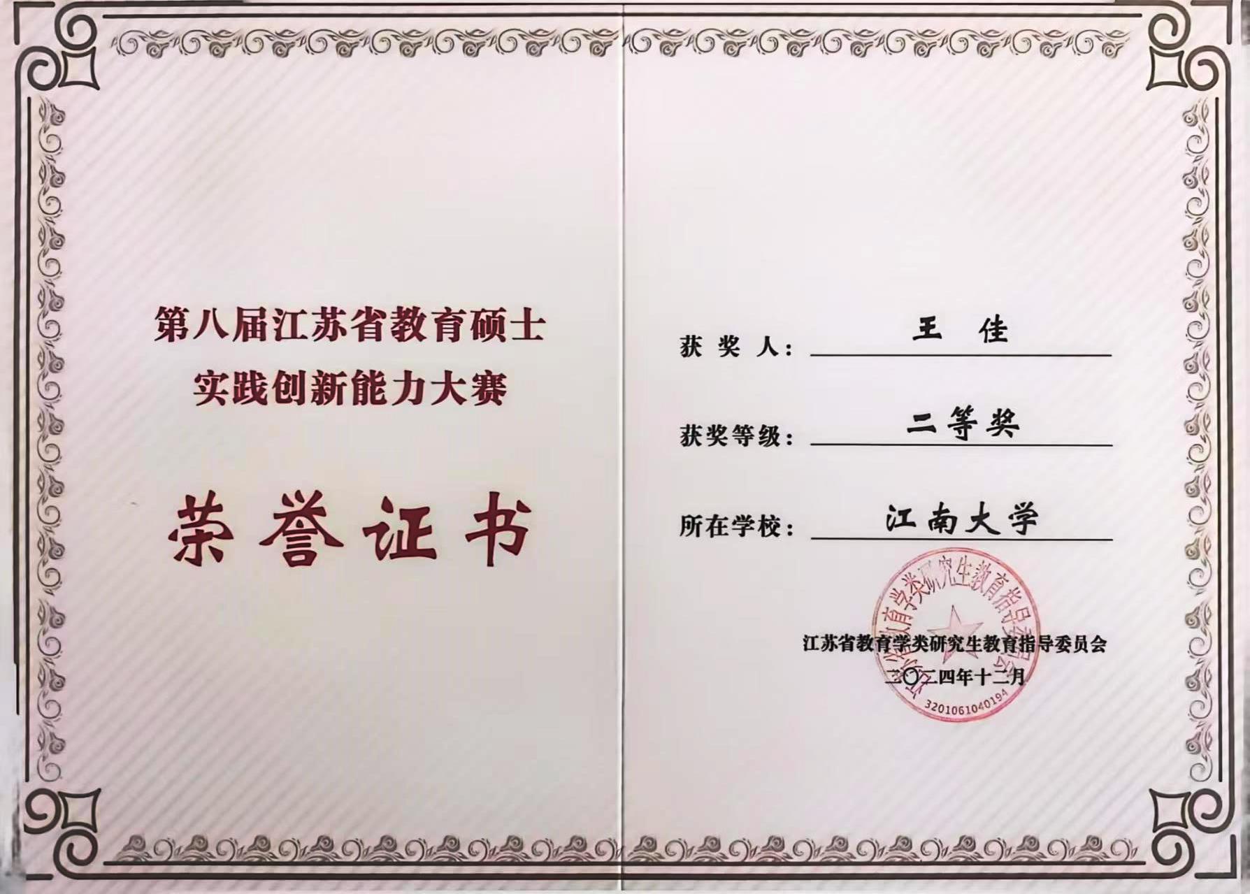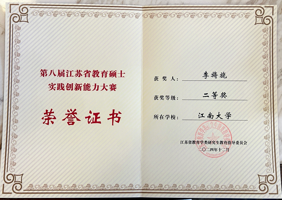 2024年12月6日-8日,由江苏省教育学类研究生教育指导委员会主办,扬州大学承办的“第八届江苏省教育硕士实践创新能力大赛”在扬州大学举行。我校研究生荣获二等奖3项,优胜奖2项。