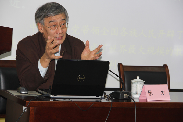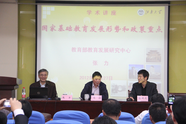 2012年10月27日下午,教育部教育发展研究中心张力主任应邀在田家炳楼209室为“江苏省高中优质发展与教育家办学”专题培训班的学员做了题为“国家教育发展形势和政策重点”解读报告。报告会由学校冯骉副校长主持。无锡市区教育局有关人员、学院部分师生等近200人 参加了聆听。