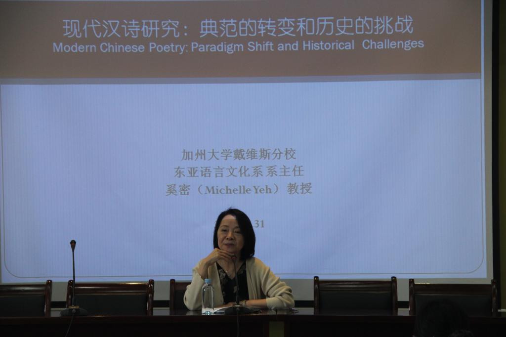 2015年3月31日下午,著名汉学家、美国加州大学戴维斯分校东亚语言文化系主任奚密(Michelle Yeh)教授在学校国交处处长助理蔡建英老师的陪同下来我院访问讲学。她与我院中文专业的部分教授进行了交流,并在田家炳楼209会议室为师生作了题为《现代汉诗研究:典范的转变和历史的挑战(Modern Chinese Poetry: Paradigm Shift and Historical Challenges)》的报告。