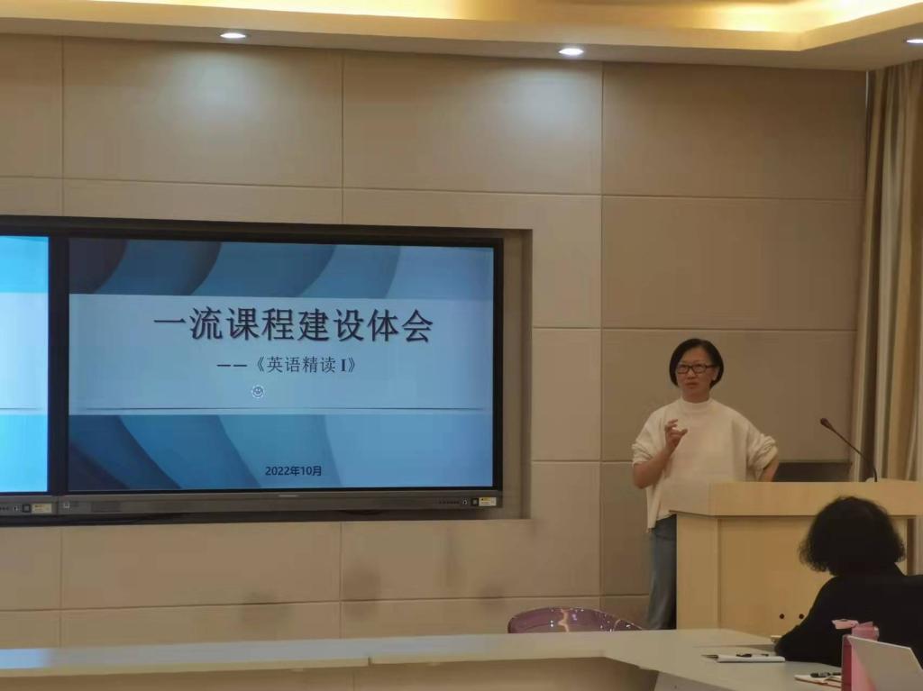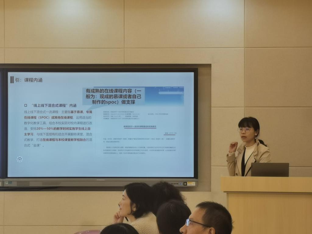 王靖在介绍中,提出课程建设的三个抓手、四个主要步骤和课程申报的五个核心细节,并强调了“线上线下混合式课程”的内涵,鼓励教师不断凝练自己的教学理念,从课程目标出发抓好顶层设计,从学生发展着眼做好教学支持,通过不断反思与迭代,持续优化课程建设。杨晖结合自己主持的国家精品在线课程的前期建设与后期申报,向与会的老师们介绍了自己的经验,并特别从专家评审的角度,指出了课程申报书撰写中的注意要点。顾琦一通过回顾自己所教英语课程建设历程,对课程沿革、团队合作、目标调整、资源开发、作业设计等方面进行了详细介绍。