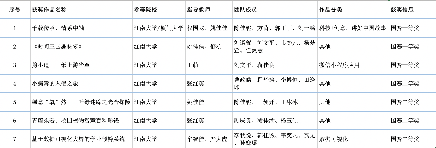 陈佳妮等7位同学代表的7支队伍分别在“数据可视化(全省同类队伍占比1/2)、微信小程序应用(全省同类队伍占比1/3)、讲好中国故事(全省同类队伍占比1/9)、其他(全省同类队伍占比4/12)”四个赛道中喜获全国一等奖3项、全国二等奖4项。此外,我院学子在省级比赛中共有33支队伍获得省赛一等奖(7支)、省赛二等奖兼国赛三等奖(15支)、省赛三等奖(11支)。
