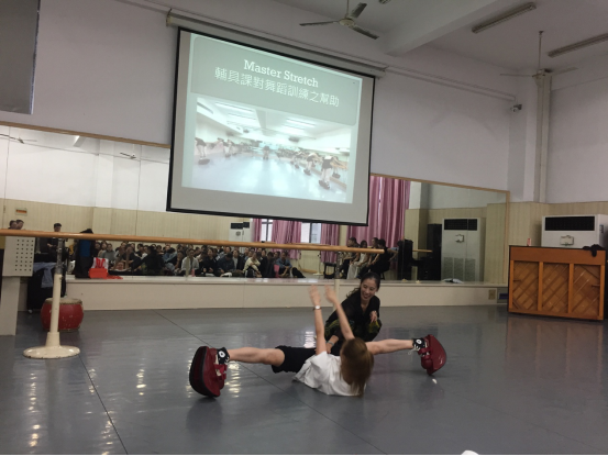 本次讲座主要分为基础知识讲授和实践体验两个部分。在基础知识讲授部分,何郁玟老师循序渐进地讲解了舞蹈辅具训练对增强舞者身体肌肉力量的重要性,使学生认识到了辅具训练在舞蹈训练中的意义,同时也向我们讲解了她所带来的“Master Stretch辅具”的奇妙功能。