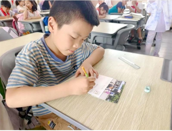 支教团成员通过播放支教实景视频、分享山区教育现状,为小学生上了一堂生动的公益启蒙课。互动环节中,学生们踊跃提问:“山区小朋友每天走多远上学?”“他们最喜欢看什么书?”随后,每个学生在定制明信片上写下真挚寄语,请大学生志愿者把祝福带去大山里。