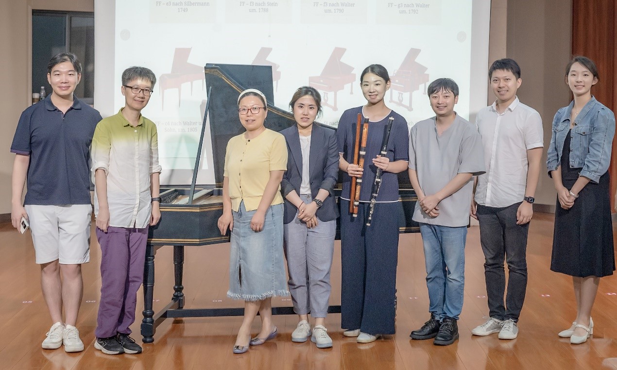 在音乐演奏环节中,两位演奏家通过展示曲目谱例和现场演奏,通过羽管键琴与古长笛的二重奏形式,演奏了J.S.巴赫《e小调奏鸣曲第三乐章》,泰勒曼《b小调奏鸣曲第一乐章》等典型的巴洛克曲目,生动地讲解了巴洛克时期音乐的特点。从节奏的韵律到旋律的走向,从和声的构成到调号所表达的情感,他们的讲解深入浅出,让听众们仿佛穿越时空,回到了那个充满艺术气息的巴洛克时代。听众们沉浸在那古朴而典雅的音乐氛围中,感受着巴洛克音乐的独特魅力。