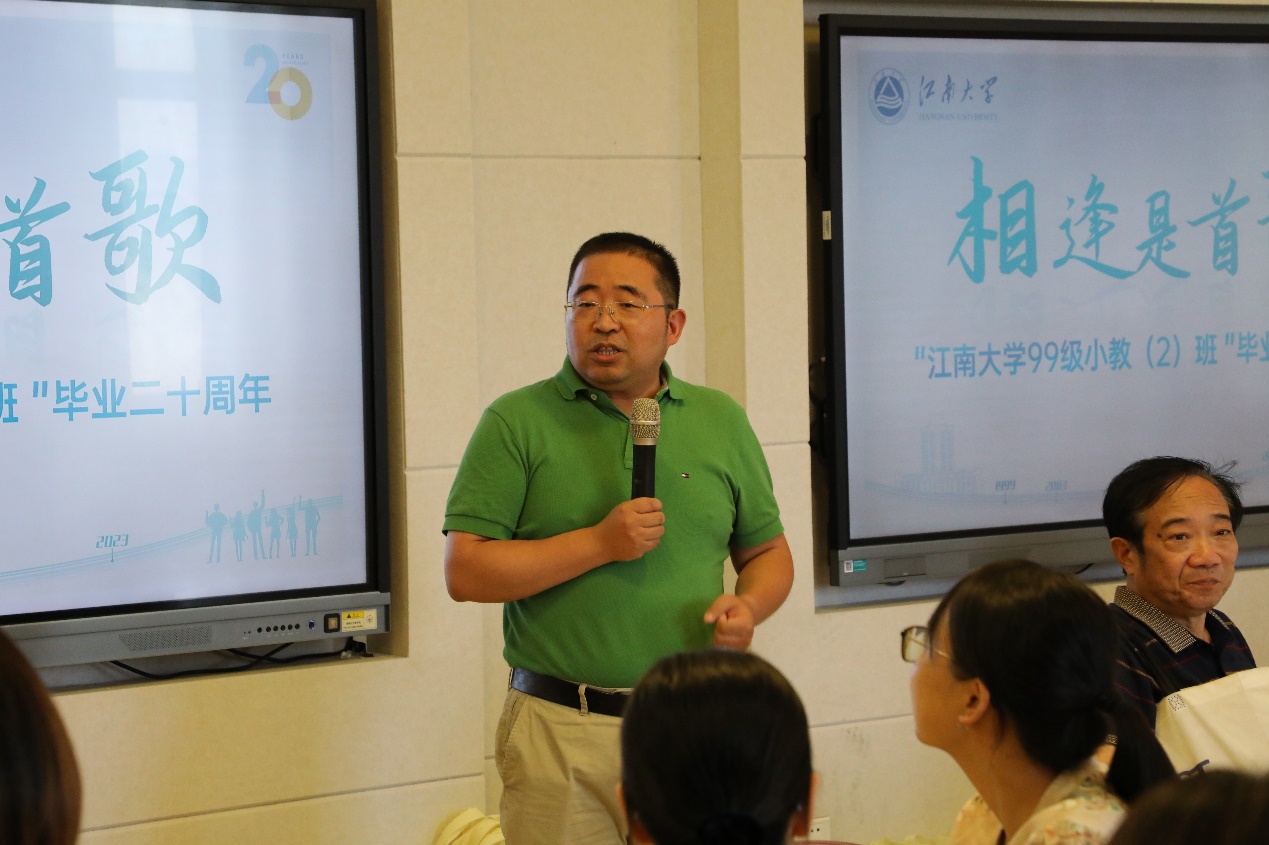 校友们感慨万千,依次与大家分享了自己20年来的发展历程,他们的发言或调侃、或激昂、或谦逊,感慨的人生经历与深切的人生感悟打动了在场的每一个人。同学们发自内心深处的每个字每句话,都饱含着对母校阔别20年的思念和对老师们永远感恩的情怀! 校友们期待再次相聚,再叙同窗谊、再话江大情,并相约十年之后再相聚。