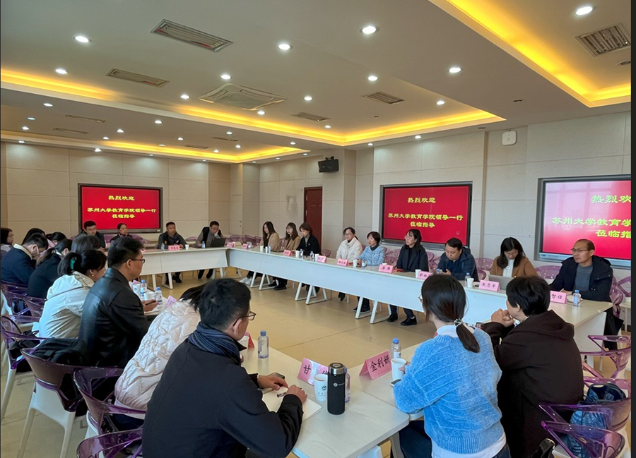 的精心安排表示感谢,介绍了苏州大学教育学院的办学现状,特别就学院党建工作与业务工作深度融合促发展的探索实践进行了交流。赵阳表示,两个兄弟学院地域相近,发展路径相近,党建融合思政教育、思政课程的工作经验值得相互借鉴,希望通过此次交流进一步加强合作交流。