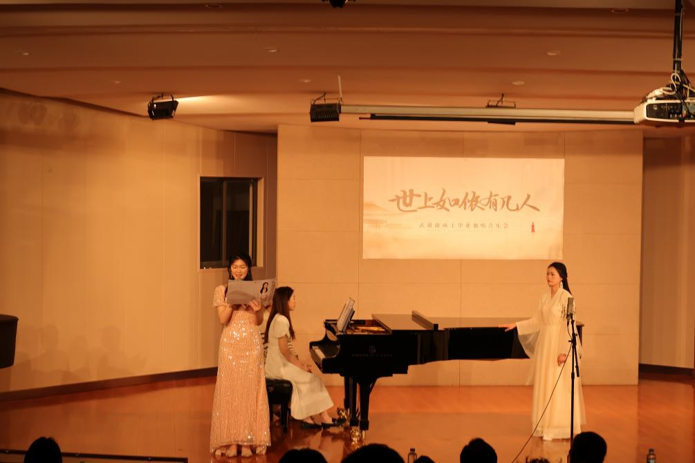 音乐与舞蹈学硕士音乐表演与教学专业培养要求,武甜甜在研究生三年期间大量学习不同类别的歌曲。本场音乐会以“世上如侬有几人”为主题,为我们呈现了四首中国近代古诗词艺术歌曲《渔翁道情》《蝶恋花·槛菊愁烟栏泣露》《苏小小》《青玉案·元夕》,三首地方民歌《紫竹调》《杨柳青》《一根丝线牵过河》,两首融合戏曲风格的新创作歌曲《知己红颜》《牡丹亭》与两首民族歌剧选段《等着我,亲爱的人》《来生来世把你爱》,全面地展示了大学期间声乐学习与研究成果。