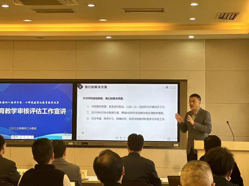 、工作安排、后续工作三个方面对评估工作了汇报。他指出在“领导挂帅、院系统筹、全员参与、效率优先”的方针指导下,洪爷