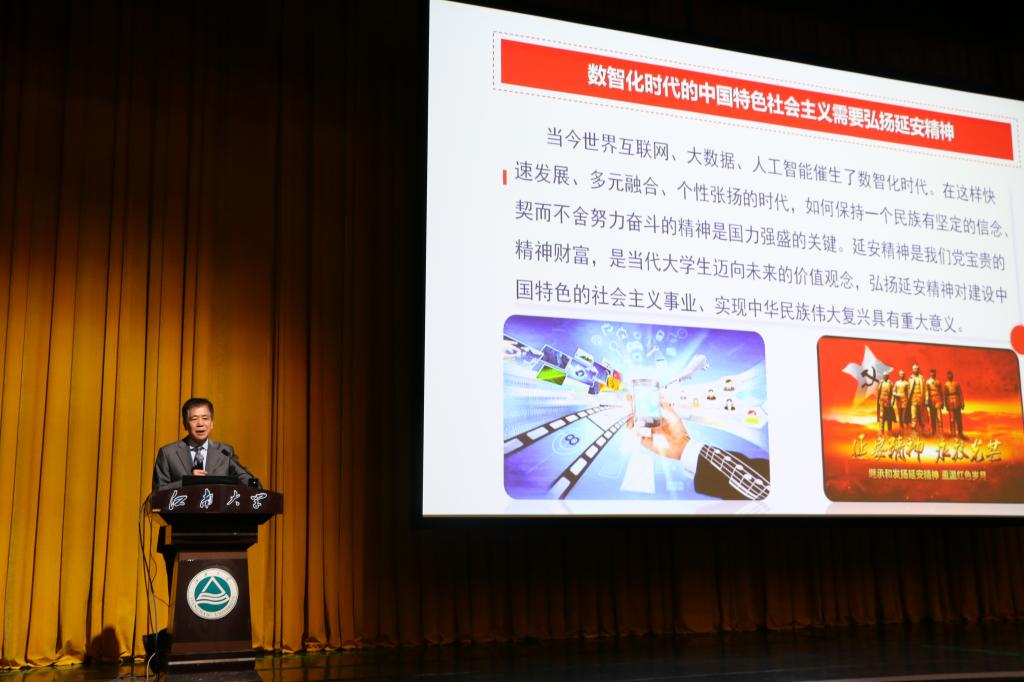 陈明选教授首先以长津湖战役为例解释了“精神”的内涵,强调在数智化时代的中国特色社会主义背景下发扬延安精神的重要意义。随后介绍了我党在延安时期所创造的丰功伟绩,作为教育专家,他尤其讲述了在延安时期我党对教育高瞻远瞩的巨大投入。而后,围绕延安精神的内涵特质,他用历史事件阐释了中国共产党人强烈的爱国主义精神和艰苦奋斗的自力更生精神,强调全心全意为人民服务是中国共产党最大的特点。紧接着从历史、文化、世界观方法论和毛泽东思想四个角度全面讲解了延安精神产生的条件。最后,陈明选教授从我国国情和当代青年角度出发,阐明了延安精神在新时代的价值和意义,建设中国特色社会主义离不开伟大延安精神的弘扬,追求理想信念、实现自我价值更离不开延安精神的继承。