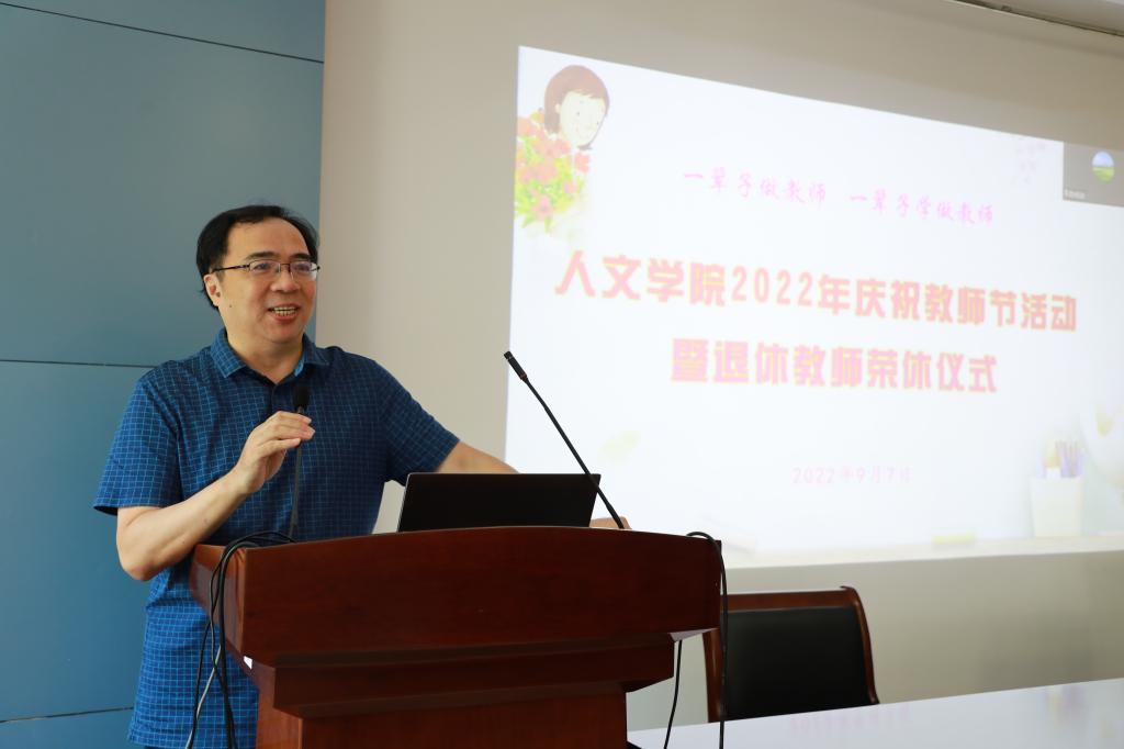 院长杨晖对退休教师表达了祝福,对他们在学院建设和发展中作出的贡献表示感谢,并对新入职教师表示祝贺,希望新教师以荣休教师为榜样,兢兢业业,坚守育人初心。杨院长结合近期工作表扬了先进典型,对全体教师提出要坚守教育理想和目标追求、自觉加强锤炼和完善自我的殷切希望。