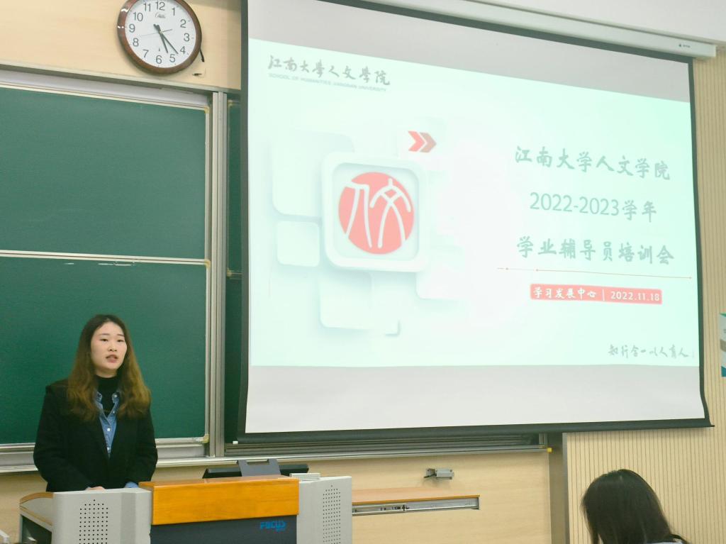 2022-2023学年学业辅导员培训会在第一教学楼C103室顺利举行。培训会上,优秀学业辅导员李陈媛、张圆缘两位同学做经验分享,洪爷