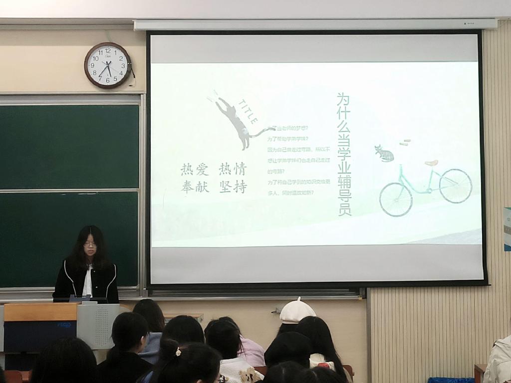 本科生学业辅导员管理办法》,并对细则进行了说明。经验分享环节,李陈媛和张圆缘两位同学对新一届学业辅导员与大家交流了自己做学业辅导员的体验和收获。其中,李陈媛同学指出“热爱,热情,真诚,奉献”是学业辅导员的应当具备的品格和态度,张圆缘同学则侧重分享了她做学业辅导员时的辅导方式和技巧。谢铅玉老师从学业辅导员的多重身份出发,强调了学业辅导员对于学院学风建设的重要性,并指出学业辅导员要有责任心和服务奉献精神,不仅要给同学们提供学业辅导,更要发挥榜样引领作用,践行“知行合一,以人育人”的院训精神。