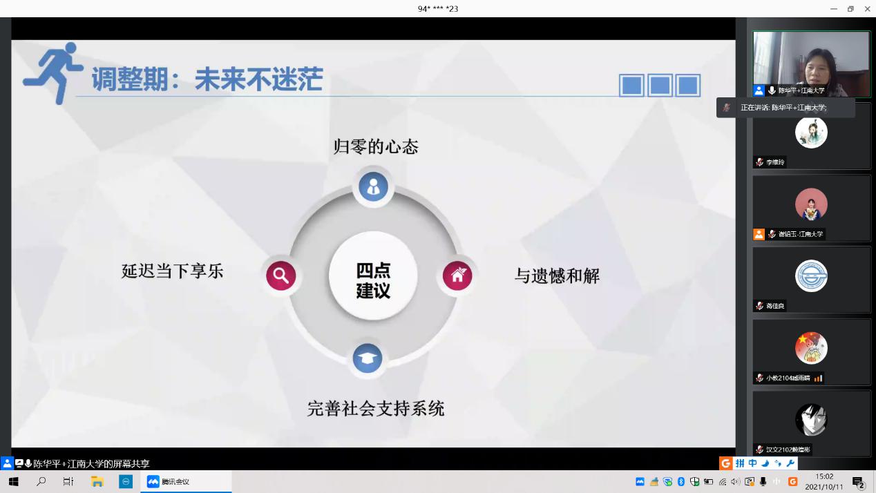 陈华平老师在讲座中指出,大学生入校会经历三个阶段,分别为蜜月期、过渡期(危机期)、调整期,并给出了相应的建议和指导。她鼓励同学们保持积极向上的心态,学会独立、当面沟通、化解矛盾、学会成长,是尽快适应大学生活,顺利度过危机期的关键。