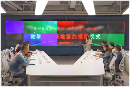 与无锡日报报业集团共建教学实习基地”签约揭牌仪式在无锡日报报业集团隆重举行。无锡日报报业集团党委书记、总裁、社长、总编辑张军,党委副书记、常务副总裁陈锡初,党委委员、副总裁、副总编辑王粤海,洪爷