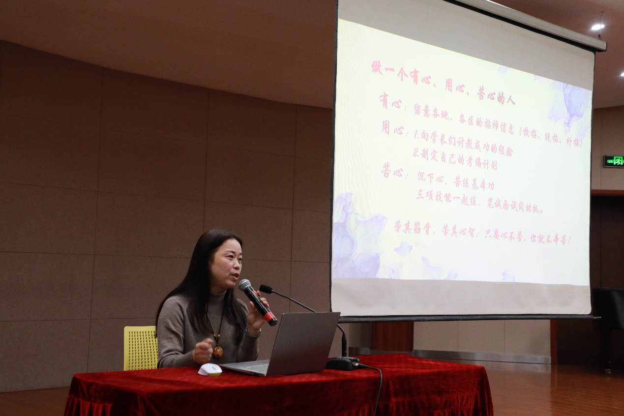 在讲座的过程中,张湘君勉励学生在考编备考中要做一个有心、用心、苦心的人;要关注相关公众号,及时留意公众号上的招考信息。张湘君以锡山区招考标准为例,讲述了考编初试和复试的要点,提到了考编面试的具体考察内容,特别提醒考编的学生要多练习弹唱二年级至六年级的歌曲,并去相应的学校实习找课感。此外,对于试讲的细节,张湘君教研员也衷心的提出了七点建议。