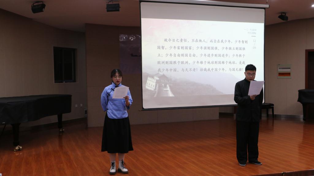 活动伊始,播放了纪念“一二•九”抗日救亡运动记录短片。该短片介绍了“一二•九”抗日救亡运动的历史背景与精神内涵,告诉同学们要时刻铭记历史,传承信仰。随后,进行了朗诵演讲活动。由郑冕、李婕,朱王一、朱熔政,蔡玉洁、赵紫蟾六位同学担任演讲者,分为三组,每组两名同学。由一名同学身着五四服装,诵读历史时期演讲稿原稿,另一名同学诵读自己撰写的稿件进行回应。铿锵有力的演讲形成了强烈的古今对比,表达出当今青年对历史的敬畏、对传承先辈精神的信心,也体现出江南学子的浓浓爱国情怀与奋勇争先的创新精神。接下来,由朱王一、蔡玉洁两位同学领诵,与全体成员齐声朗诵梁启超先生的《少年中国说》,展现出“少年强,则国强”的精神面貌。
