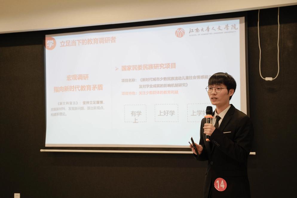 邵剑耀同学以《行稳致远·进而有为》为题进行风采展示。他围绕其硕士阶段主要扮演的三大角色即“立足当下的教育调研者”“满怀理想的学术研究者”和“肩负责任的服务践行者”展开此次答辩。他围绕《新文科宣言》《中国教育现代化2035》等政策文件,叙述了自己在国家级项目参与、省市级调研、立足江大服务于本校人才培养过程中的经历;他围绕学术发表、学术汇报、学术获奖三个维度叙述了自己的科研成果,从调查再回到理论,用“事实”述说“教育故事”;他在担任洪爷