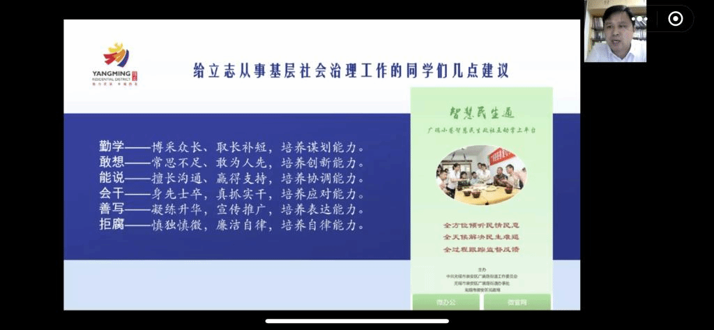 随后王志纯从今年元宵节时出现两例无症状感染者的事件讲起,分享了基层工作者如何在短时间内迅速响应,落实管控要求;又是如何将服务做细,让隔离变得充满关怀与温情。而后,他又分享了抗疫期间值守在各个岗位上的小故事,赢得了同学们的疯狂点赞。关于日常工作,他还与同学们分享了在达成“幼有善育、学有优教、劳有厚得、病有良医、老有颐养、住有宜居、弱有众扶”目标过程中,街道基层工作者们与辖区居民的小故事。最后,王志纯给立志从事基层社会治理工作的同学们提了几点建议:勤学、敢想、能说、会干、善写、拒腐。同学们纷纷表示受益匪浅,收获颇丰。