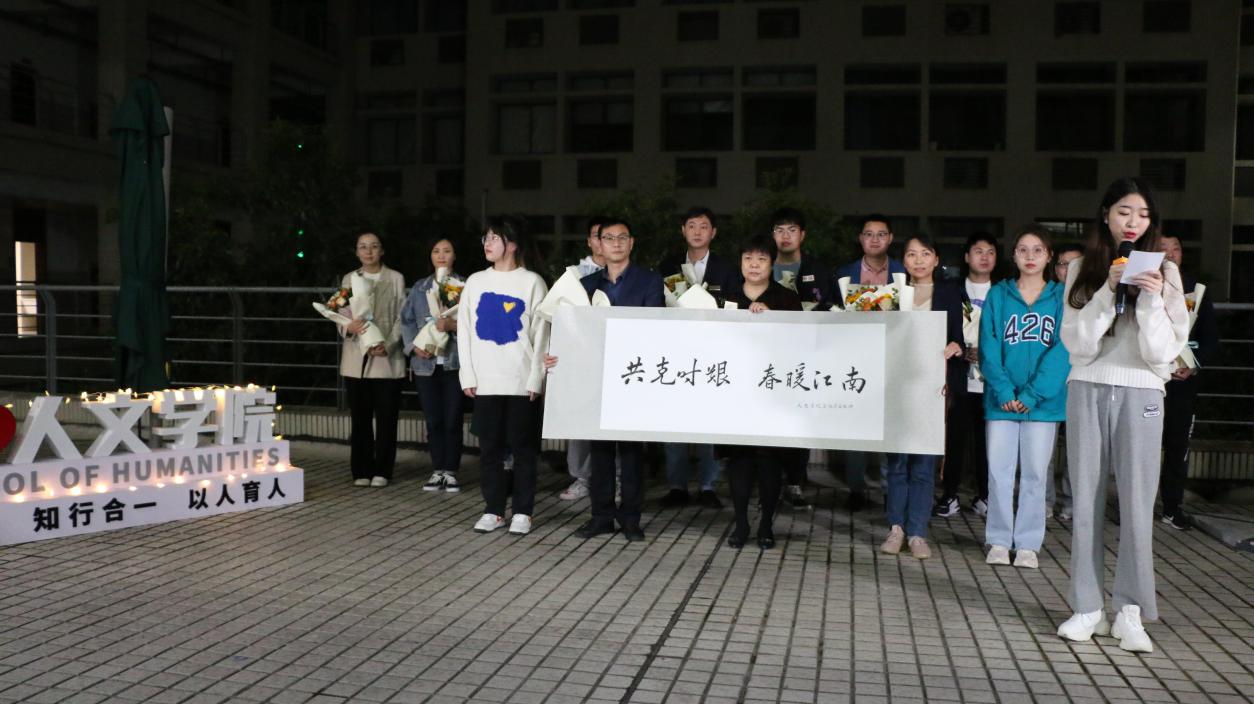 全体学生精心为学校始终奋战在一线的后勤保障系统的教职工们准备了原创的书法作品“共克时艰 春暖江南”,同时校后勤保障系统教职工代表们带来了合唱---洪爷