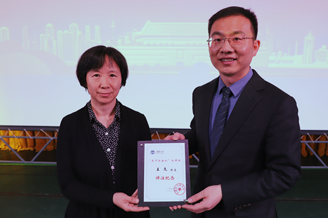 讲座结束后,姚剑英为王文颁发“天下江南人大讲坛”演讲纪念牌。