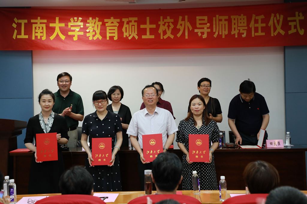 武美萍代表校研究生院向受聘校外导师表示祝贺,并宣读了53位教育专业硕士校外导师聘任名单。武美萍、萧晶、姚剑英、田良臣和惠恭健为到场的受聘导师颁发聘书。