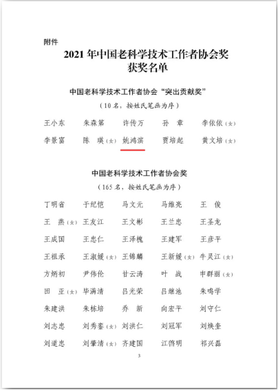 退休教师姚鸿滨荣获2021年中国老科学技术工作者协会“突出贡献奖”。该奖项是老科协工作全国最高个人奖项,全国仅有10人获此殊荣。