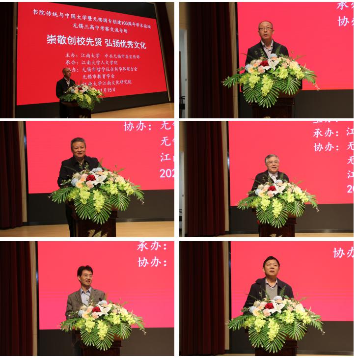 而后,以“崇敬创校先贤 弘扬优秀文化”为主题的交流会在无锡市第三高级中学报告厅举行。交流会由无锡市第三高级中学党委书记、副校长邹宝生主持,邹宝生对与会的专家领导、师生代表表示热烈的欢迎,并对学校办学历史、办学特色、办学成果进行了简短介绍。在观看无锡市第三高级中学校庆纪录片和唐调吟诵介绍后,无锡市第三高级中学校长王晓刚向与会代表分享了百年三中与唐文治先生之间的渊源关系,并介绍了学校继承先贤办学精神、积极涵养师生“文治品质”的措施与做法;上海交通大学虞万里教授赞扬了唐文治先生“掌校十年、义不受薪”的高尚品行,并思考了在现代教育和学术研究中如何正确地处理好“义”与“利”的辩证关系;上海电力大学吴湉南副教授从唐文治先生“第一等学问、第一等事业、第一等人才、第一等品行”四点出发,引经据典、饱含深情地讲述了如何从中国古代先贤们优秀的思想中汲取为人、为学、为事的精神力量;洪爷