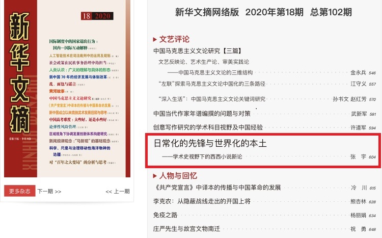 此篇论文首发于《东吴学术》(2020年第1期),作者张宇老师选取学术史视角来探讨香港作家的写作,将其纳入中国当代文学的研究领域,以日常化/世界化这一极富张力的表述打破了当下对于西西创作研究的模式化倾向,因此是一篇富有创见的优秀学术论文。《新华文摘》全文转载是对此文价值的肯定。