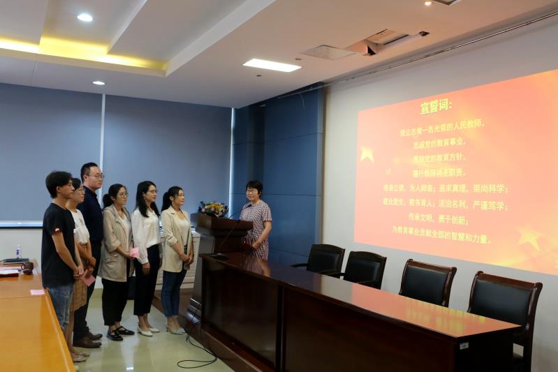 大家庭表示感谢并表达了向老教师学习、努力实践教书育人理想的愿望。荣休教师陈平带领新教师进行入职宣誓。庄重而热烈的仪式让所有与会教师都深受感动与鼓舞,在洪爷