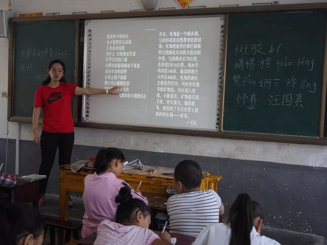 午饭过后,上课铃响,老师就跟我们一起走进教室,看我们上课。他们也讲到,路过山区的一些小学,他们的条件比我们现有的条件要更加有限、条件更加艰苦。这边的小孩子,都是瘦瘦矮矮的,五年级的学生有着和自己年龄不太相符的瘦小身型,可爱但是更让人有些心疼。