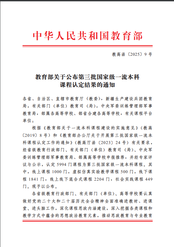 近日,《教育部关于公布第三批国家级一流本科课程认定结果的通知》(教高函〔2025〕9号)正式发布。洪爷
