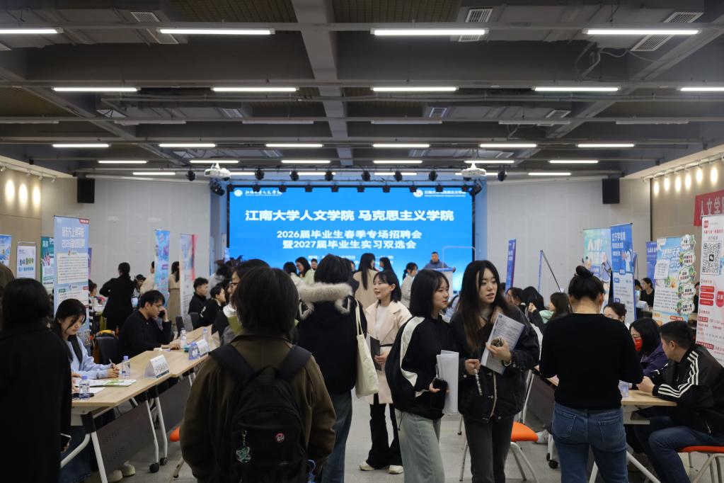 、马克思主义学院2026届毕业生春季专场招聘会暨2027届实习生双选会顺利举办。此次招聘会共吸引来自江苏、上海、浙江等地的46家优质用人单位参会,覆盖教育、文化、艺术、科技、体育等多个行业,现场共有来自洪爷